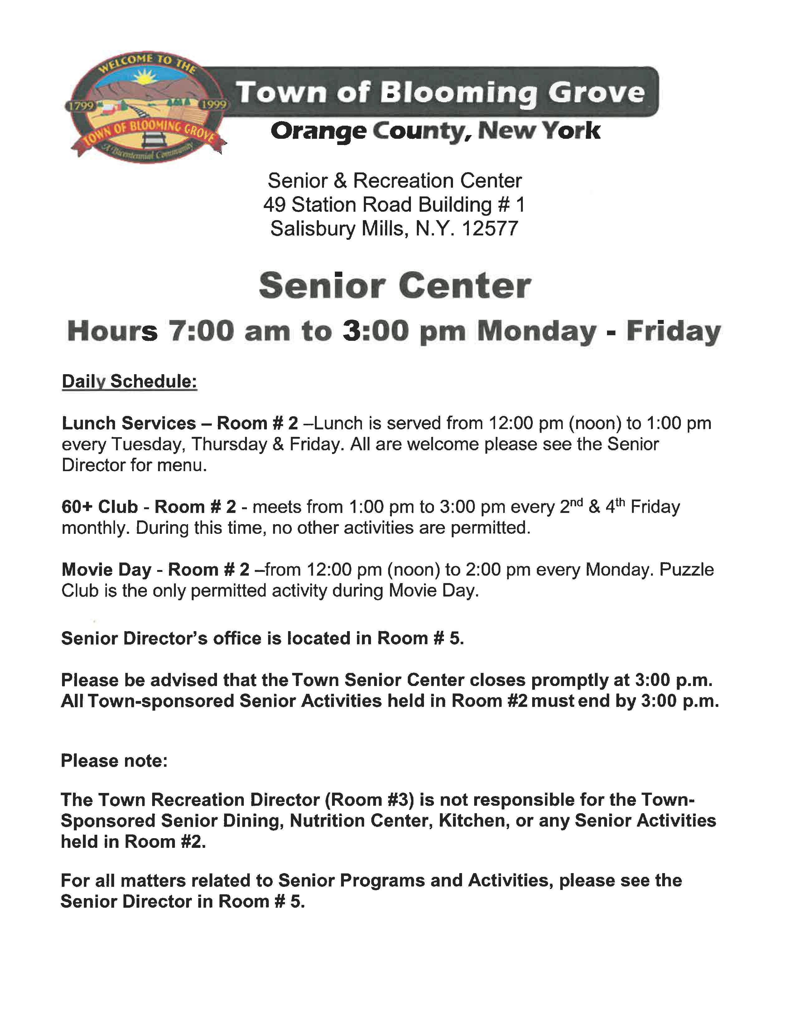 The Blooming Grove Nutrition Center, in conjunction with the Orange County Senior Dining Program, provides nutritious meals to eligible people ages 60 and over. While no fees are mandated for congregate or home delivered meals, confidential $3.50 per meal voluntary contributions are suggested. These contributions are utilized to expand the program.